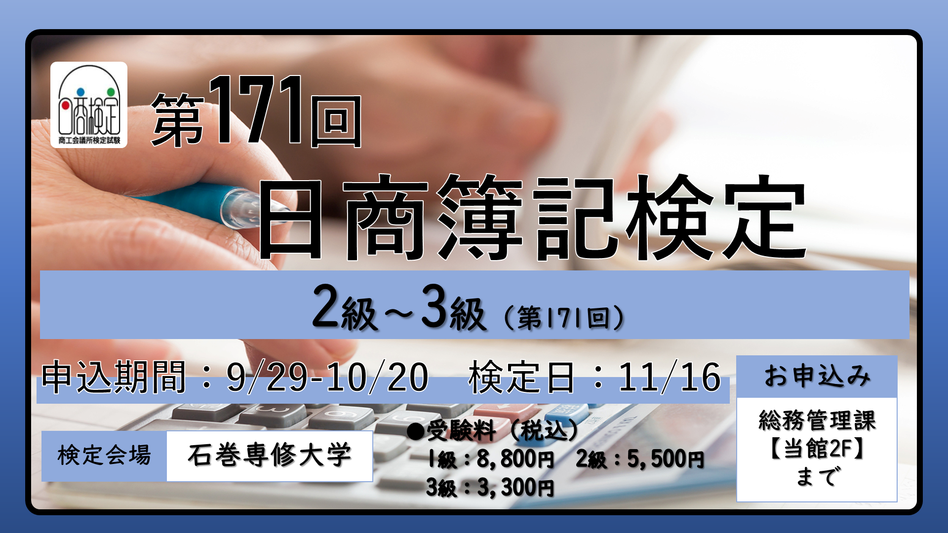 - 2025-09-29 第171回日商簿記検定試験 申込受付を開始しました。